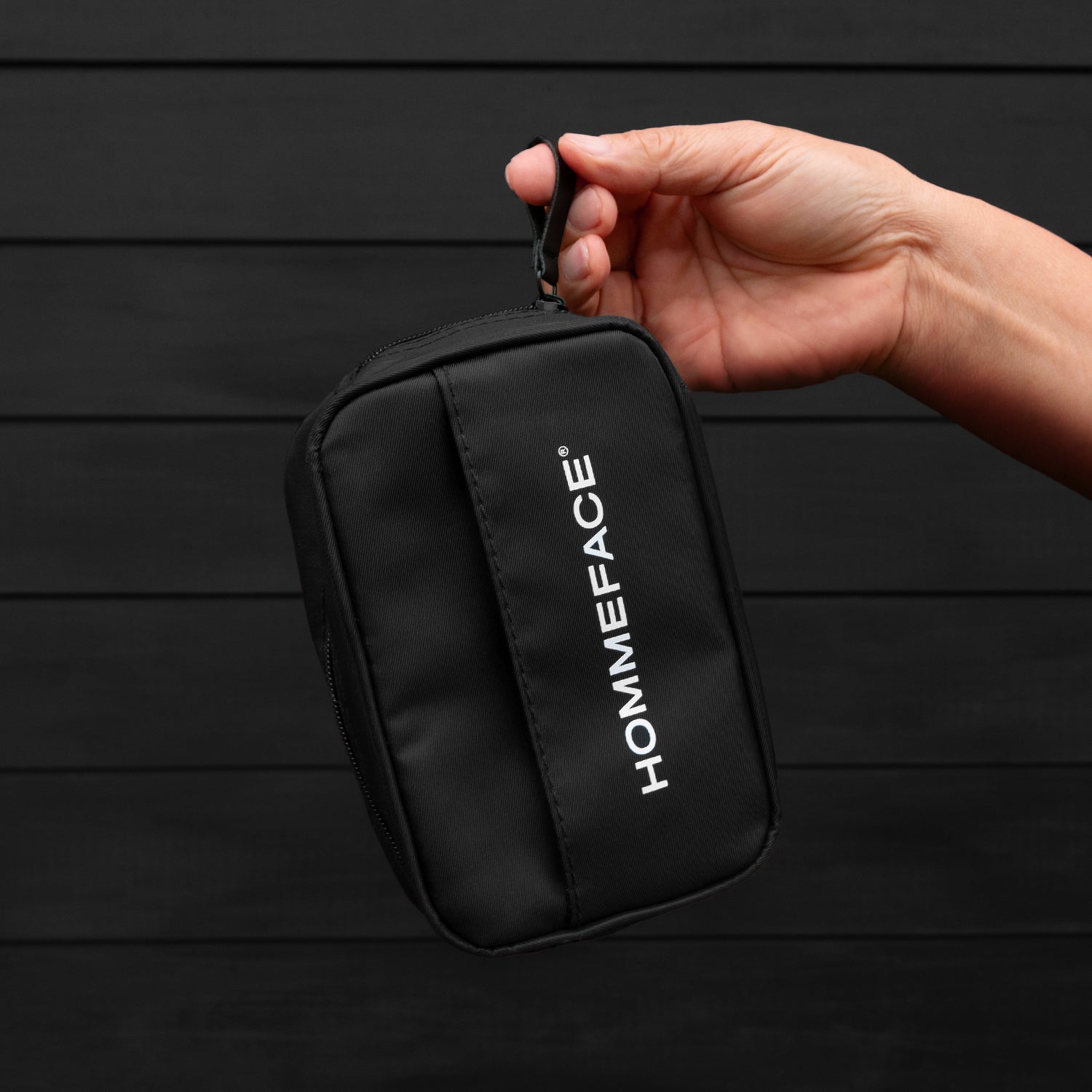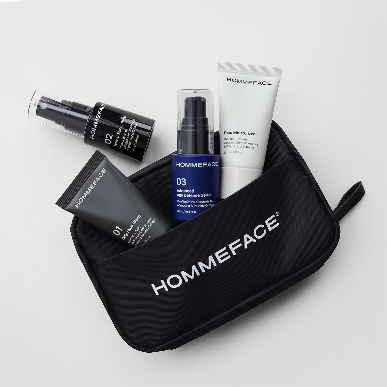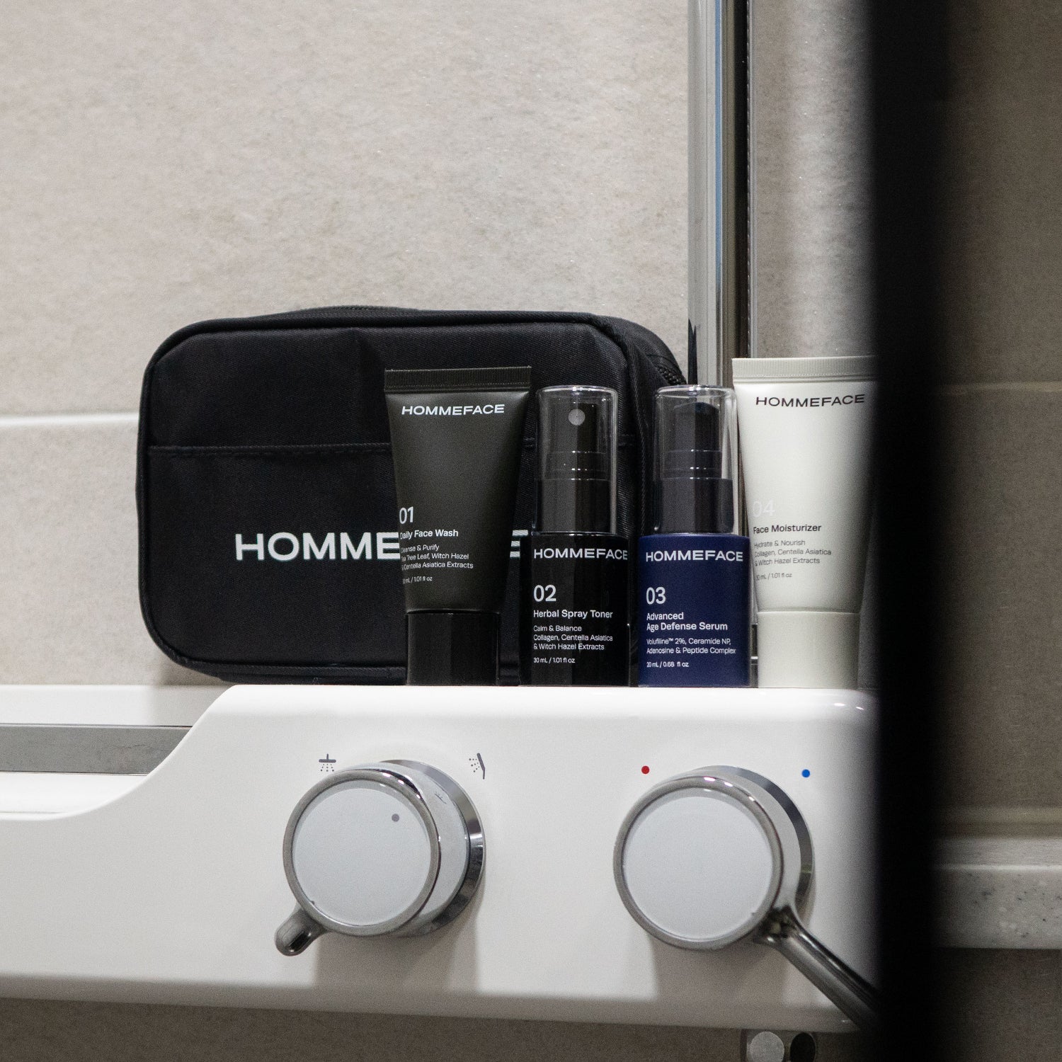Includes 4 travel-size essentials and a waterproof toiletry bag. Suitable for all skin types.